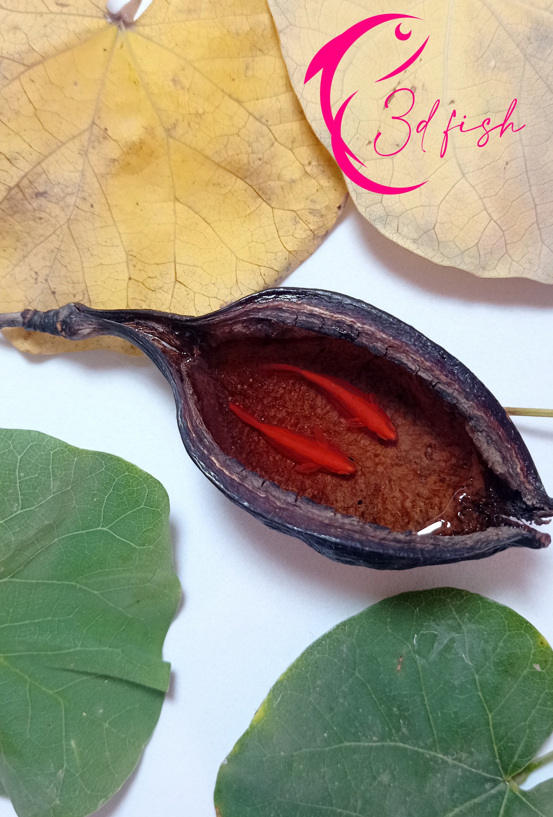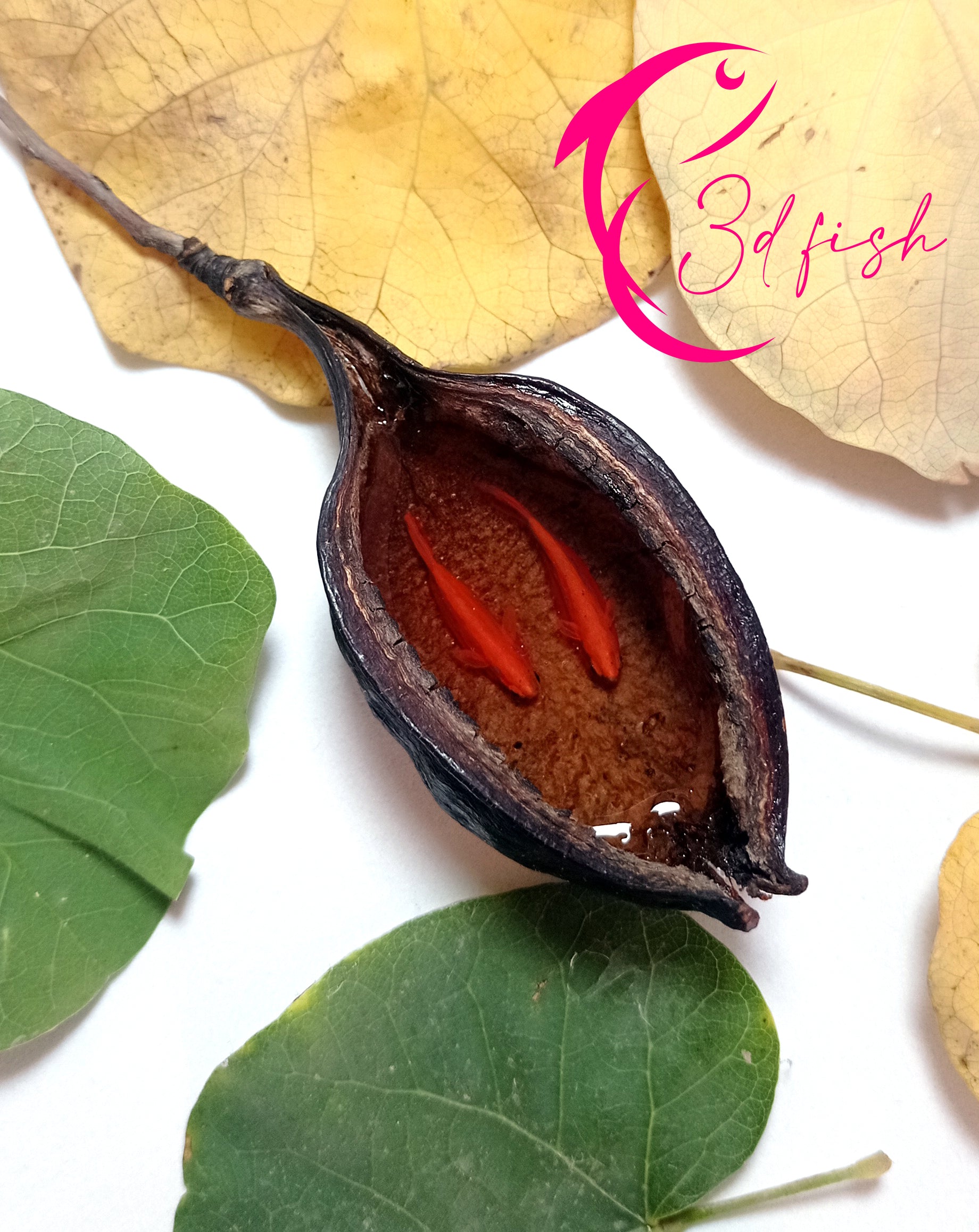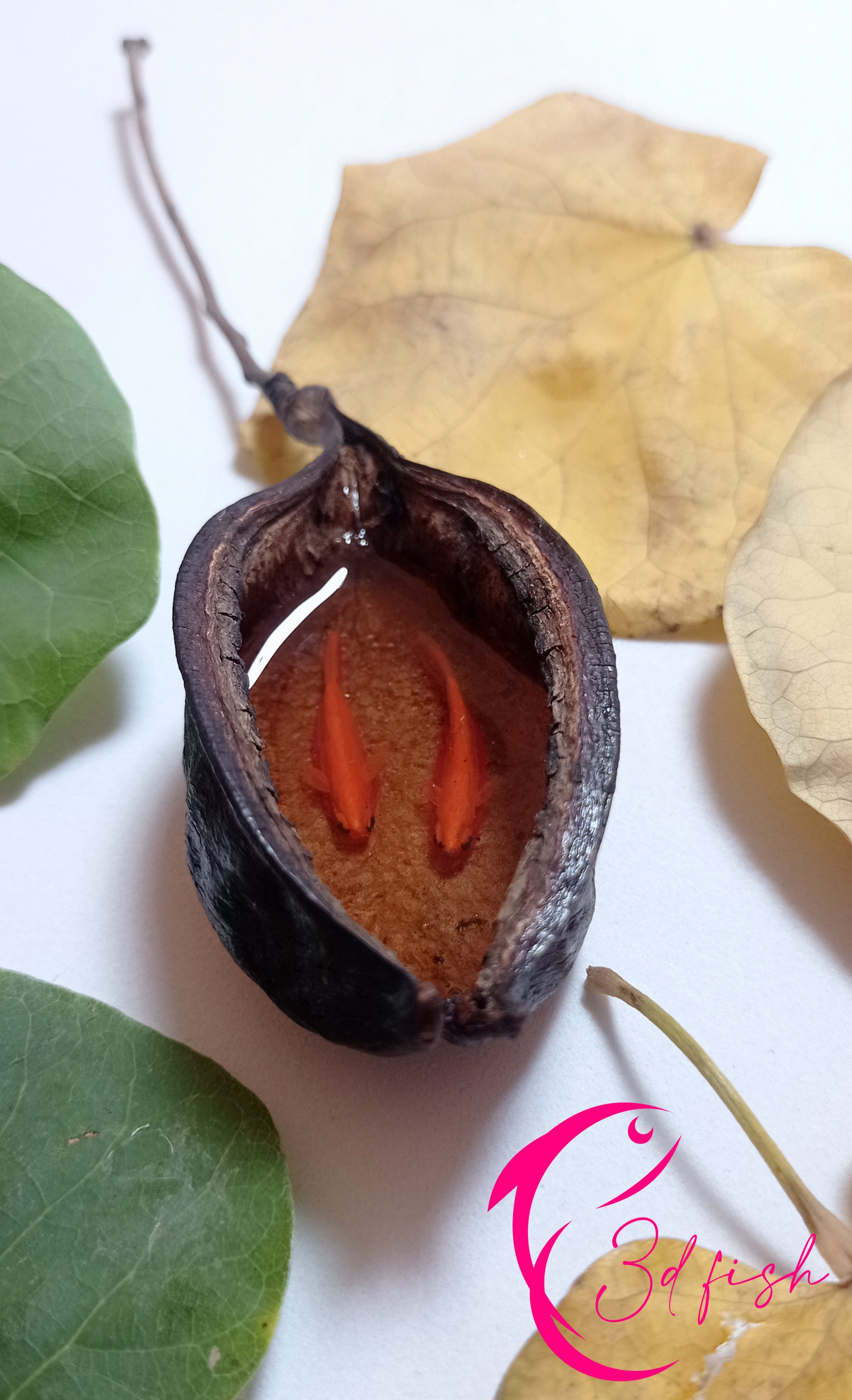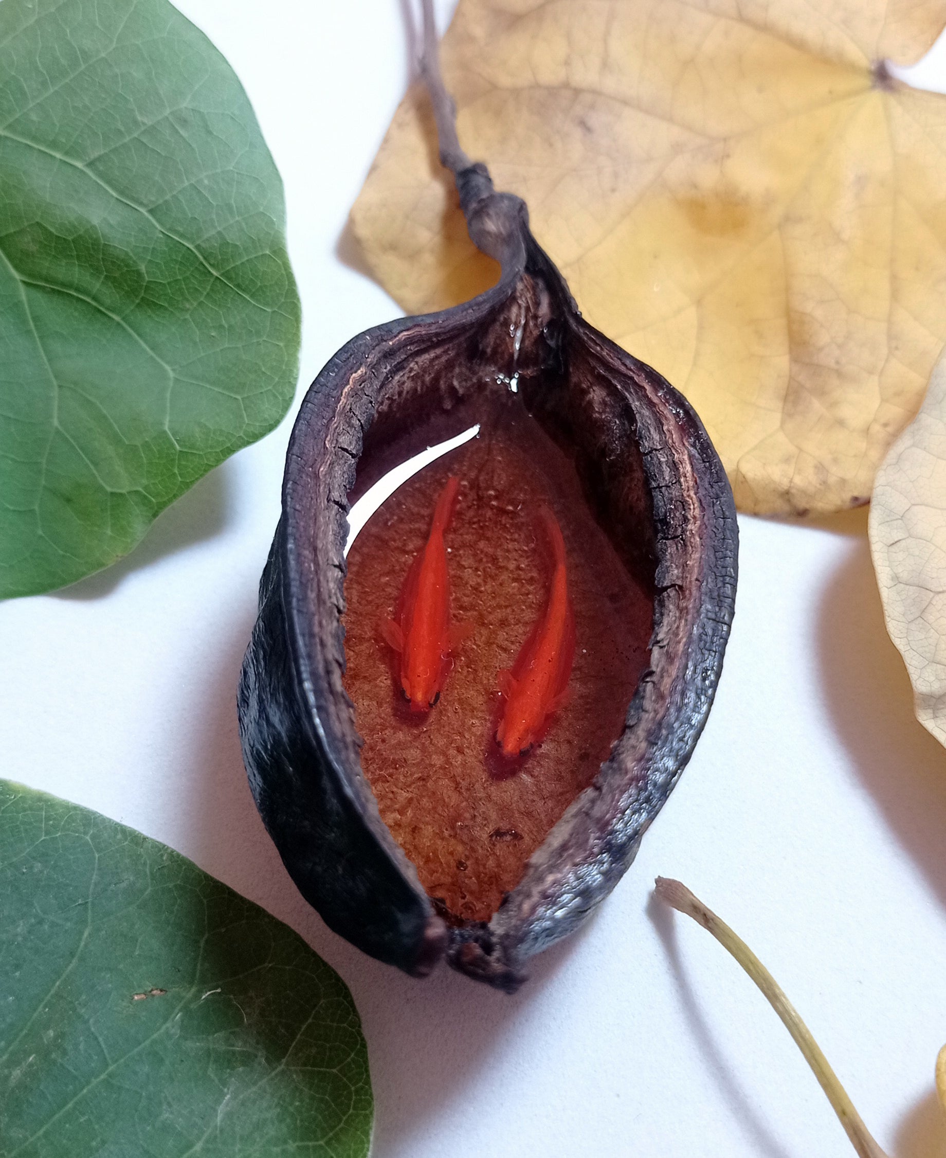 No es el nombre más común, lo sabemos, pero es que precisamente esta obra fue realizada dentro de una vaina que contiene el fruto del árbol conocido como "braquiquito" o árbol botella. Una pieza especialmente delicada y única en su composición, origen y acabado. Una pequeña joya que destila delicadeza a raudales.