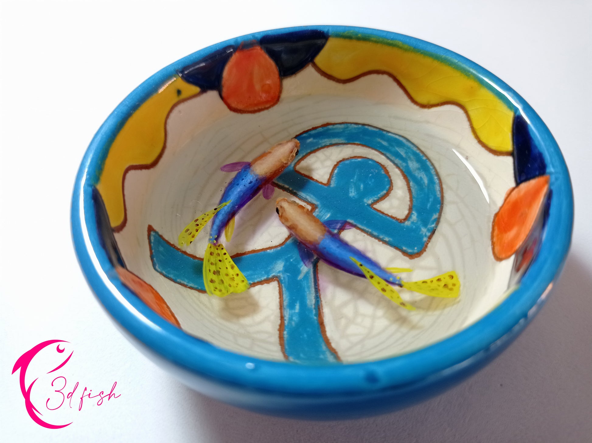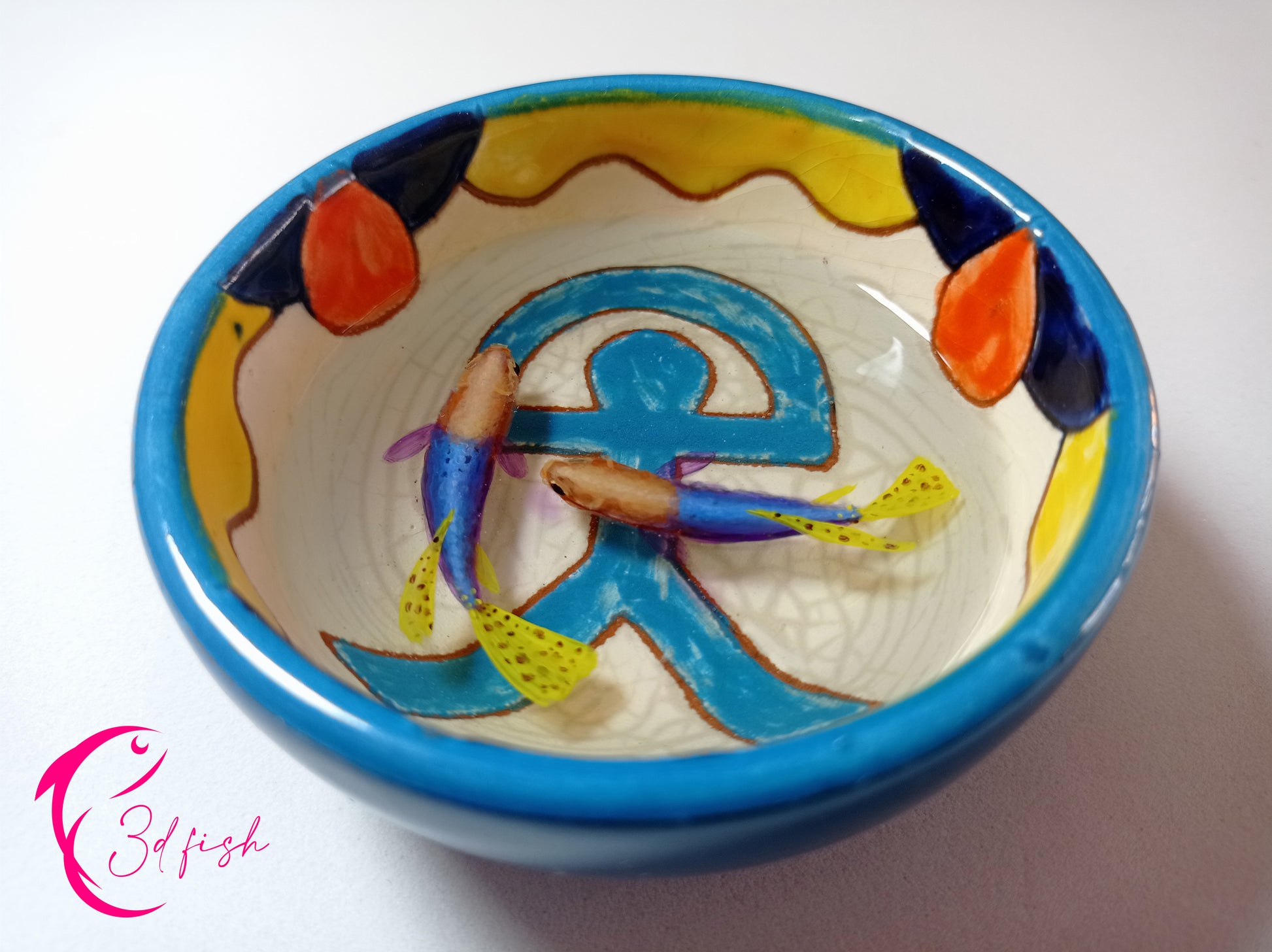 Esta es una pieza sumamente especial, donde dos guppys multicolor nadan en un bol de cerámica que tiene al Indalo como protagonista. Este símbolo propio de la provincia de Almería, el cuál es considerado como símbolo de buena suerte y el más representativo de esta hermosa zona de España.