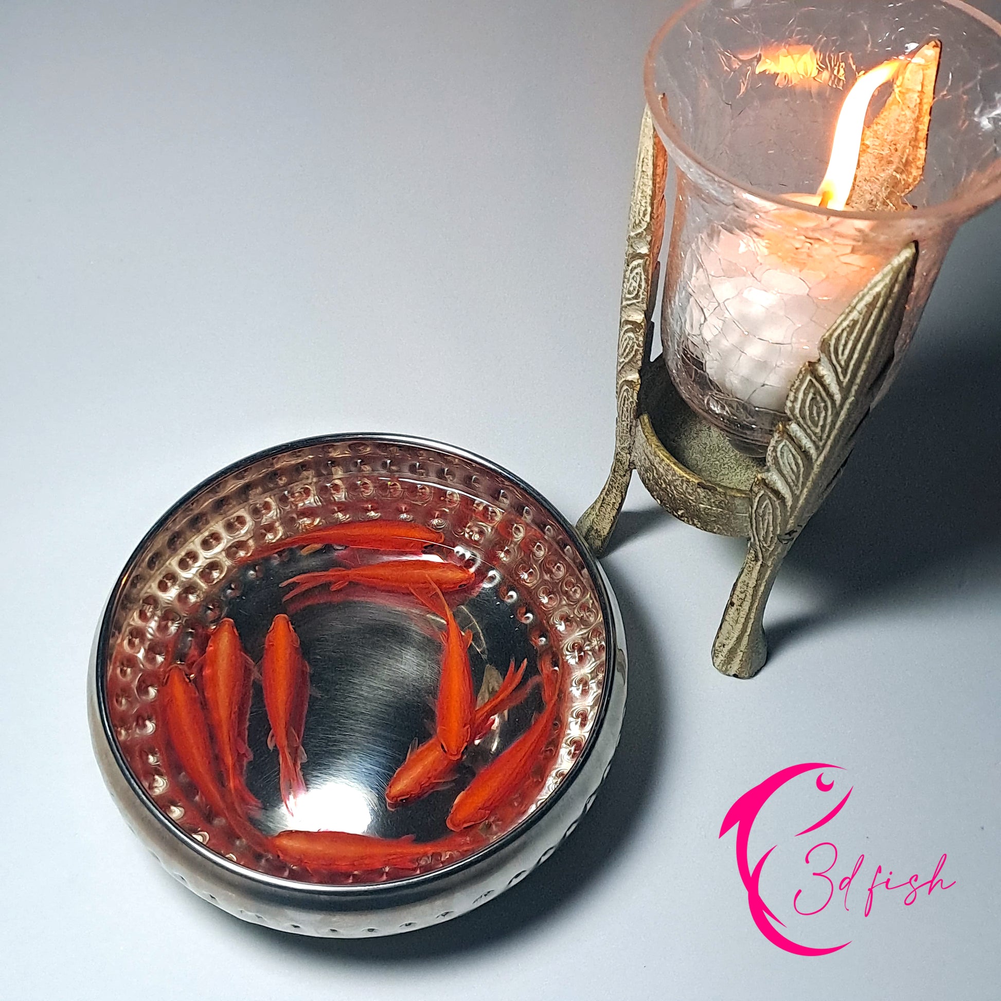 Impresionante obra de arte que representa una escena acuática de peces rojos realizada sobre un cuenco metálico repujado a mano. La obra está totalmente pintada a mano con pintura acrílica sobre diferentes capas de resina creando un realista efecto tridimensional, dotándola de una belleza única, ideal para decorar cualquier espacio de tu hogar.
