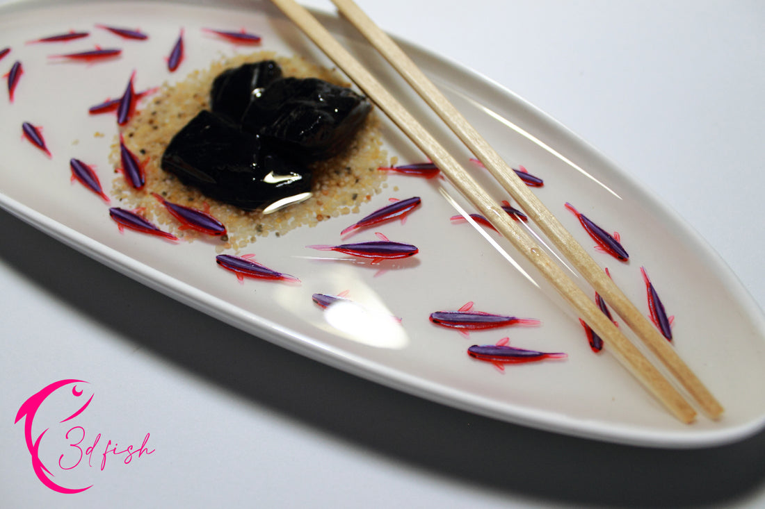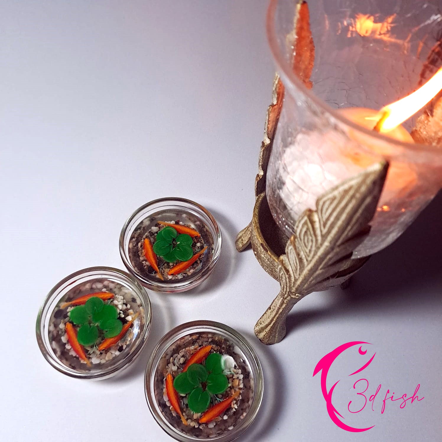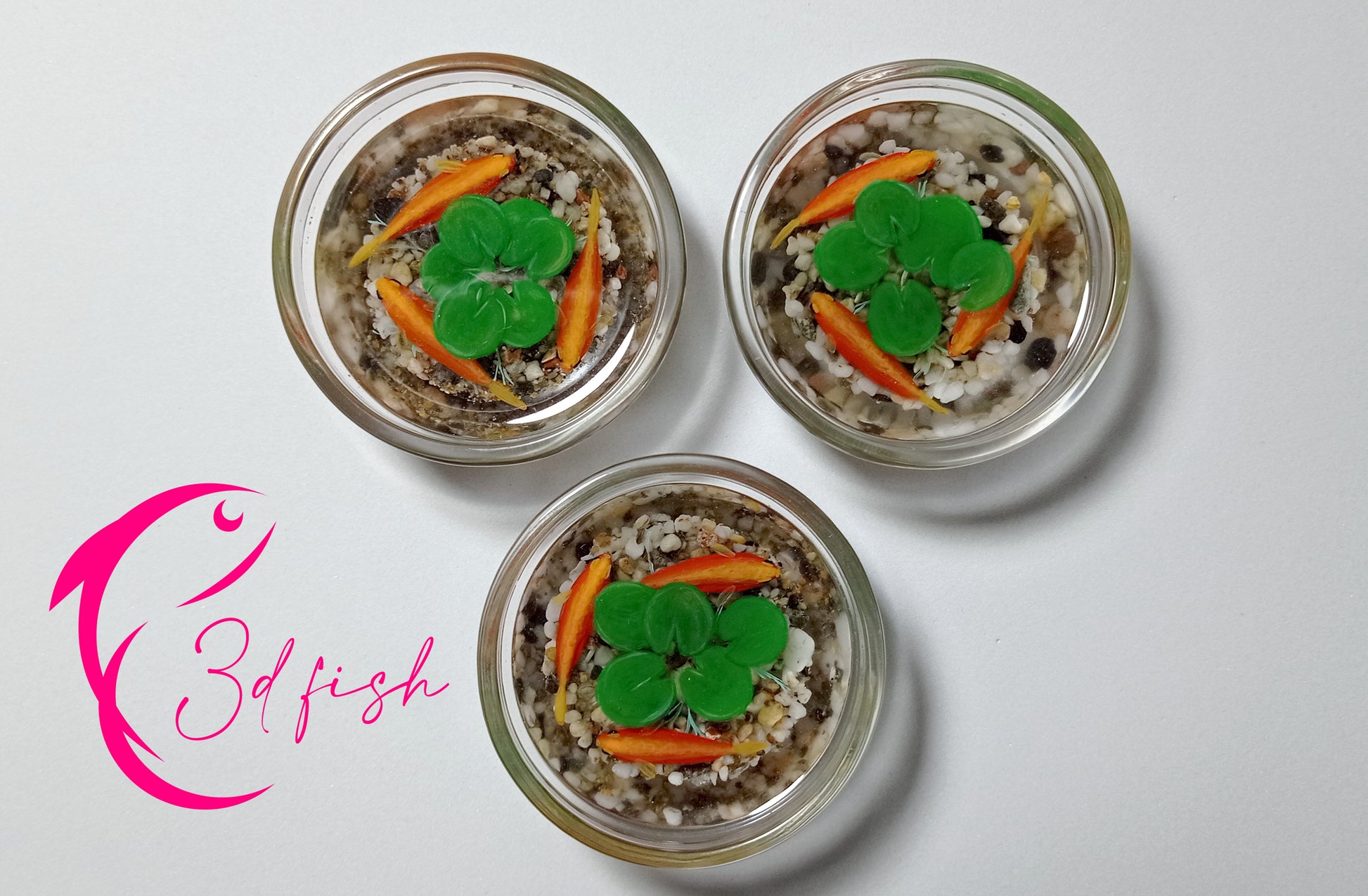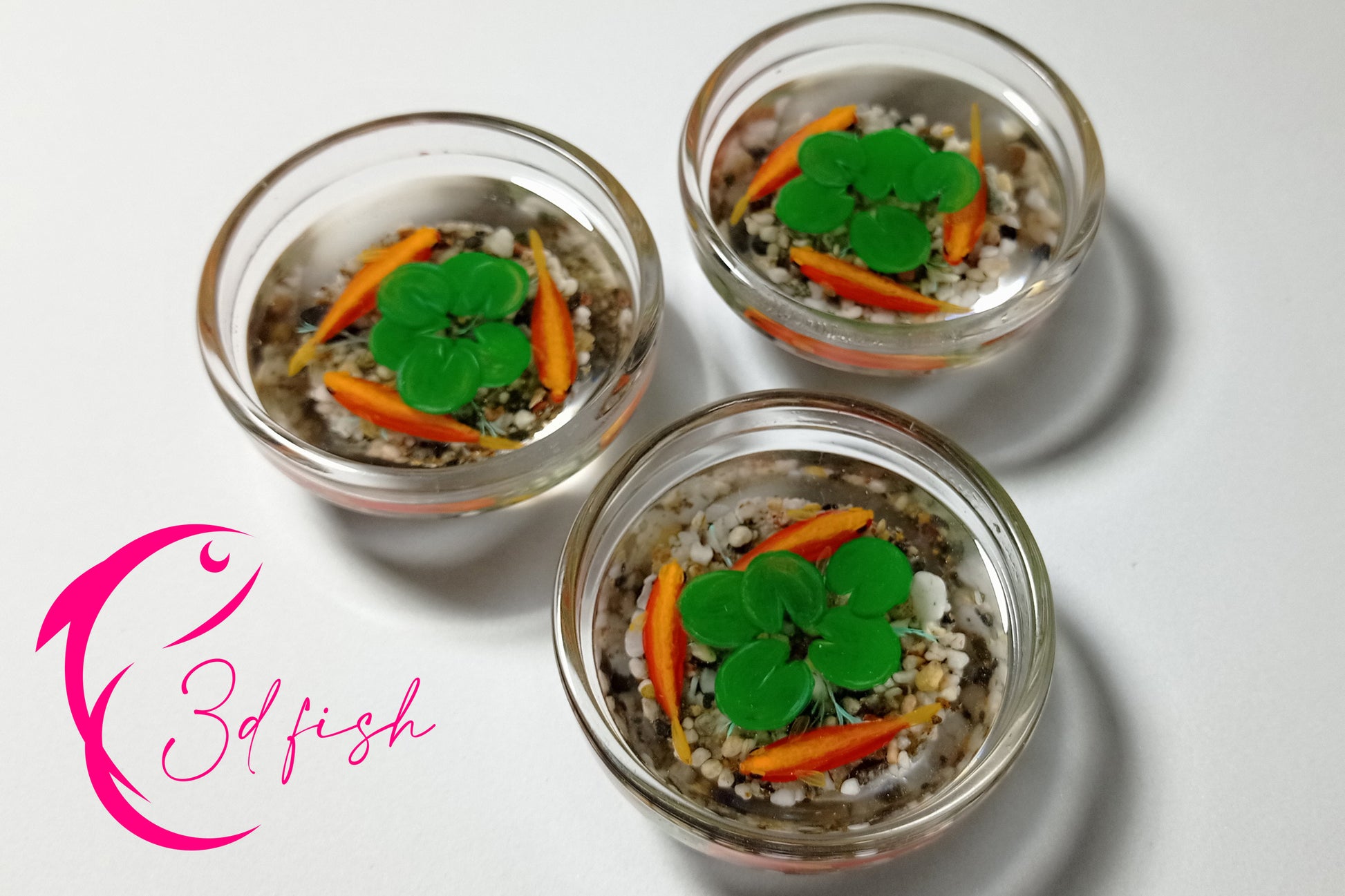 ¡Tres hermosas obras en una! Cuencos de cristal decorados con arena de las playas de Almería, cada una con tres peces naranjas y hojas de loto pintadas a mano sobre capas de resina. ¡Sencillamente espectaculares!