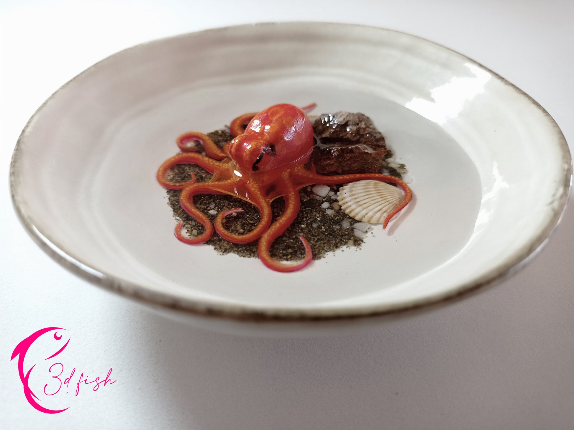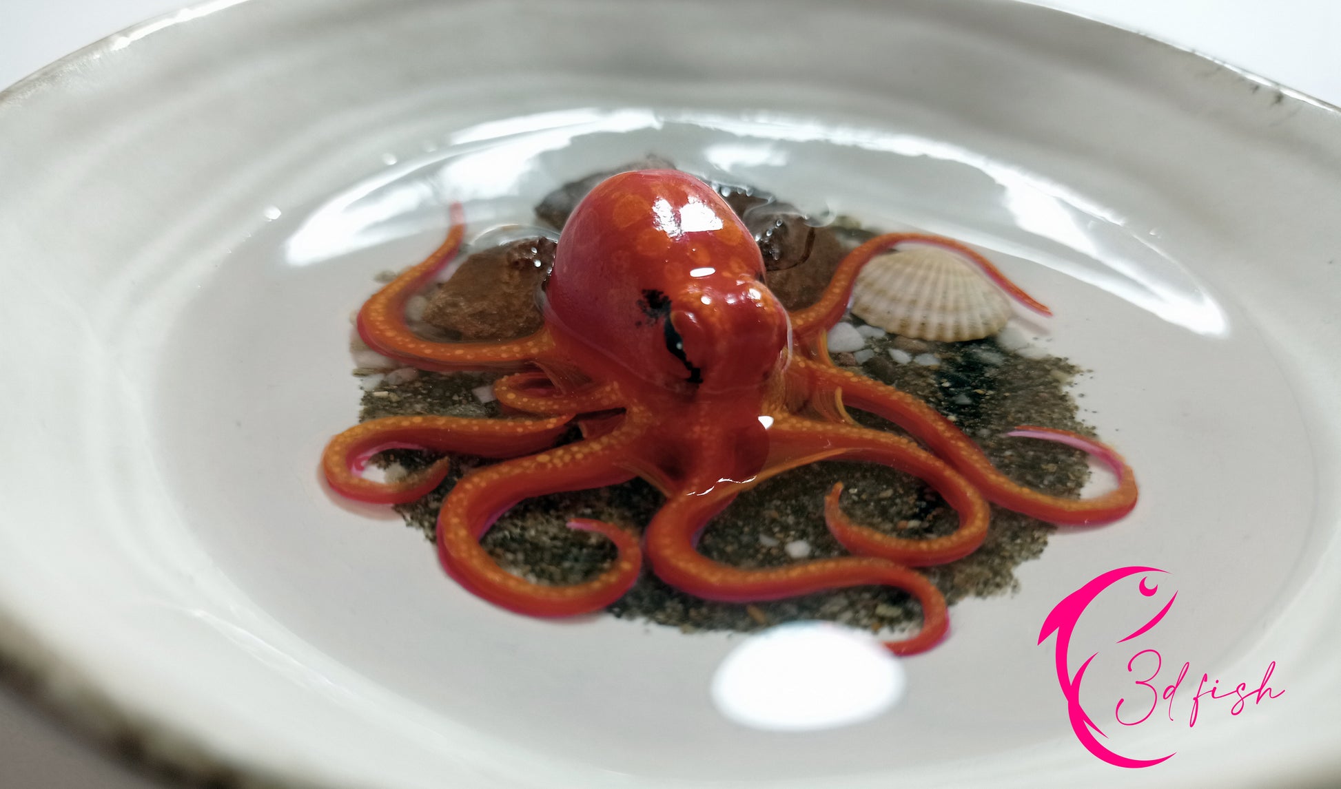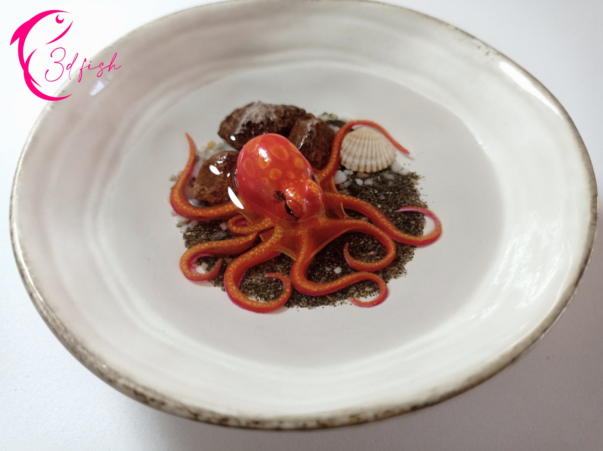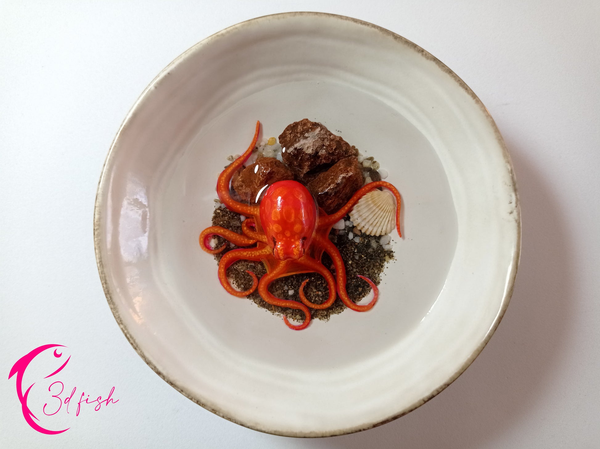 Una obra maravillosa, llena de detalles y un trabajo laborioso que representa una hermosa escena marina, digna de un arrecife coralino que tiene por protagonista un precioso pulpo rojo que tiene una técnica mixta de arcilla polimérica y pintura acrílica sobre capas de resina, todo decorado con elementos naturales extraídos de las playas de Almería, como guijarros, arena y una pequeña concha. La belleza y tranquilidad del mar en tus manos.